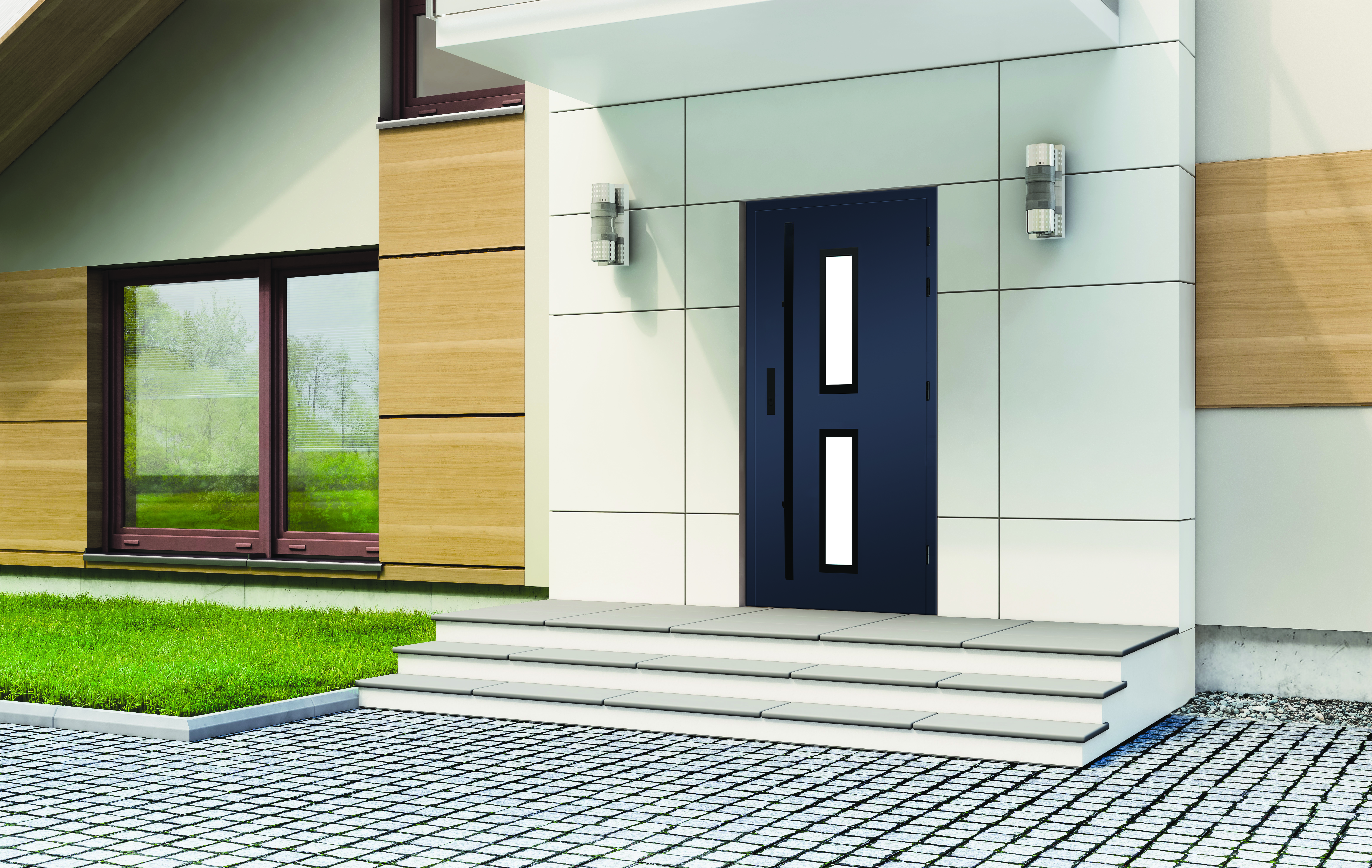 Granatowe drzwi zewnętrzne